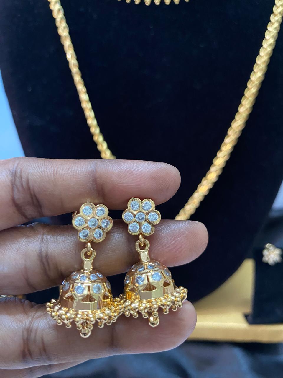Description: Elegant Impon jimmikki earrings featuring sparkling white stones. Perfect for traditional and modern looks.