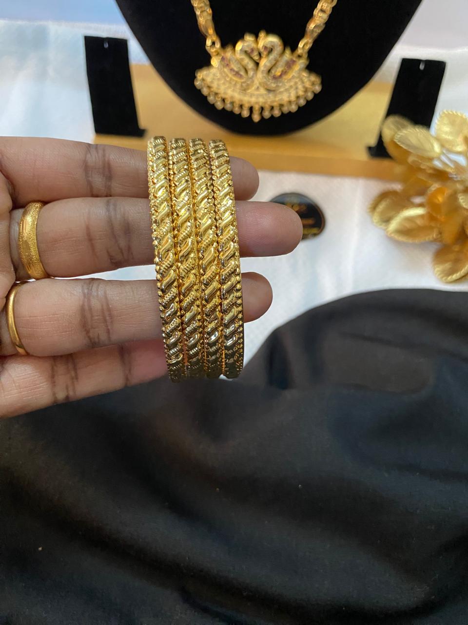 Description: Elegant and durable gold covering bangles, set of 4, suitable for any occasion.